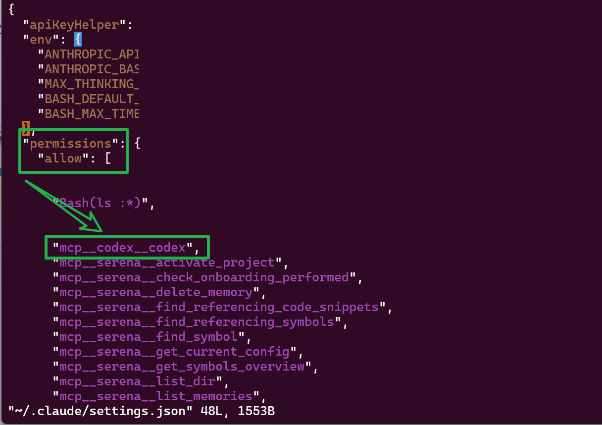 1.4 可选择默认允许claude code自动与codex交互,在~/.claude/settings.json添加 mcp__codex__codex allow项