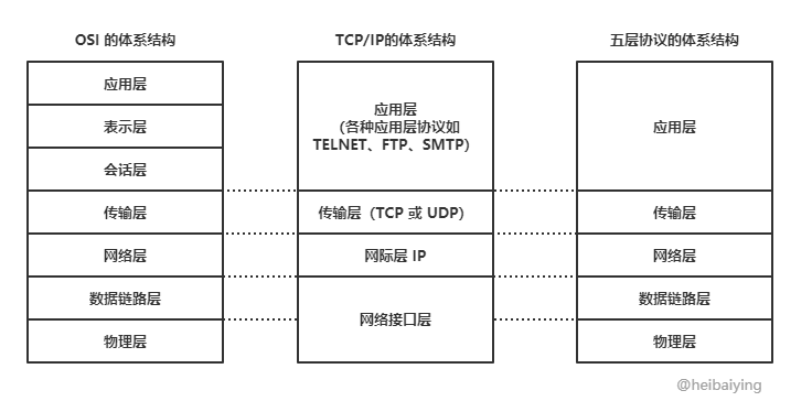 # 计算机网络 ## 一、体系结构 计算机网络的各层及其协议的集合被称为网络的体系结构,按照不同的维度,其常被分为七层、五层、四层网络结构: ### 1.1 七层网络模型 开放式系统互联模型(Open System Interconnection Model,简称为 OSI 模型)是一种概念模型,由国际标准化组织提出,并试图成为计算机在世界范围内互连为网络的标准框架,它具有七层网络结构。 ### 1.2 四层网络模型 互联网协议套件(Internet Protocol Suite,IPS)是多个网络传输协议的集合,它为网际网络的基础通信提供架构支撑。由于该协议族中最核心的两个协议分别为 TCP(传输控制协议)和 IP(网际协议),因此它也被称为 TCP/IP 协议族(TCP/IP Protocol Suite 或 TCP/IP Protocols),简称 TCP/IP,它具有四层网络结构 。 ### 1.3 五层网络模型 OSI 七层网络模型由国际标准化组织进行制定,它是正统意义上的国际标准。但其实现过于复杂,且制定周期过长,在其整套标准推出之前,TCP/IP 模型已经在全球范围内被广泛使用,所以 TCP/IP 模型才是事实上的国际标准。TCP/IP 模型定义了应用层、传输层、网际层、网络接口层这四层网络结构,但并没有给出网络接口层的具体内容,因此在学习和开发中,通常将网络接口层替换为 OSI 七层模型中的数据链路层和物理层来进行理解,这就是五层网络模型: