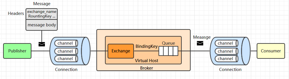 ### 1. Publisher(发布者) 发布者 (或称为生产者) 负责生产消息并将其投递到指定的交换器上。 ### 2. Message(消息) 消息由消息头和消息体组成。消息头用于存储与消息相关的元数据:如目标交换器的名字 (exchange_name) 、路由键 (RountingKey) 和其他可选配置 (properties) 信息。消息体为实际需要传递的数据。 ### 3. Exchange(交换器) 交换器负责接收来自生产者的消息,并将将消息路由到一个或者多个队列中,如果路由不到,则返回给生产者或者直接丢弃,这取决于交换器的 mandatory 属性: + 当 mandatory 为 true 时:如果交换器无法根据自身类型和路由键找到一个符合条件的队列,则会将该消息返回给生产者; + 当 mandatory 为 false 时:如果交换器无法根据自身类型和路由键找到一个符合条件的队列,则会直接丢弃该消息。 ### 4. BindingKey (绑定键) 交换器与队列通过 BindingKey 建立绑定关系。 ### 5. Routingkey(路由键) 生产者将消息发给交换器的时候,一般会指定一个 RountingKey,用来指定这个消息的路由规则。当 RountingKey 与 BindingKey 基于交换器类型的规则相匹配时,消息被路由到对应的队列中。 ### 6. Queue(消息队列) 用于存储路由过来的消息。多个消费者可以订阅同一个消息队列,此时队列会将收到的消息将以轮询 (round-robin) 的方式分发给所有消费者。即每条消息只会发送给一个消费者,不会出现一条消息被多个消费者重复消费的情况。 ### 7. Consumer(消费者) 消费者订阅感兴趣的队列,并负责消费存储在队列中的消息。为了保证消息能够从队列可靠地到达消费者,RabbitMQ 提供了消息确认机制 (message acknowledgement),并通过 autoAck 参数来进行控制: + 当 autoAck 为 true 时:此时消息发送出去 (写入TCP套接字) 后就认为消费成功,而不管消费者是否真正消费到这些消息。当 TCP 连接或 channel 因意外而关闭,或者消费者在消费过程之中意外宕机时,对应的消息就丢失。因此这种模式可以提高吞吐量,但会存在数据丢失的风险。 + 当 autoAck 为 false 时:需要用户在数据处理完成后进行手动确认,只有用户手动确认完成后,RabbitMQ 才认为这条消息已经被成功处理。这可以保证数据的可靠性投递,但会降低系统的吞吐量。 ### 8. Connection(连接) 用于传递消息的 TCP 连接。 ### 9. Channel(信道) RabbitMQ 采用类似 NIO (非阻塞式 IO ) 的设计,通过 Channel 来复用 TCP 连接,并确保每个 Channel 的隔离性,就像是拥有独立的 Connection 连接。当数据流量不是很大时,采用连接复用技术可以避免创建过多的 TCP 连接而导致昂贵的性能开销。 ### 10. Virtual Host(虚拟主机) RabbitMQ 通过虚拟主机来实现逻辑分组和资源隔离,一个虚拟主机就是一个小型的 RabbitMQ 服务器,拥有独立的队列、交换器和绑定关系。用户可以按照不同业务场景建立不同的虚拟主机,虚拟主机之间是完全独立的,你无法将 vhost1 上的交换器与 vhost2 上的队列进行绑定,这可以极大的保证业务之间的隔离性和数据安全。默认的虚拟主机名为 `/` 。 ### 11. Broker 一个真实部署运行的 RabbitMQ 服务。 ## 五、交换器类型 RabbitMQ 支持多种交换器类型,常用的有以下四种: ### 5.1 fanout 这是最简单的一种交换器模型,此时会把消息路由到与该交换器绑定的所有队列中。如下图,任何发送到 X 交换器上的消息,都会被路由到 Q1 和 Q2 两个队列上。