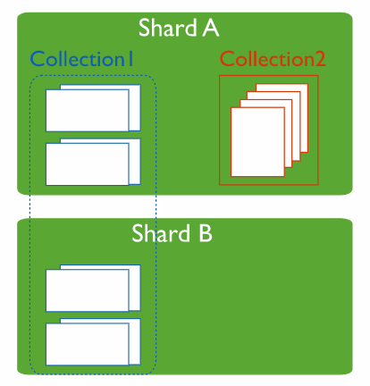 ### 1.6 非分片集合 以上的所有讲解都是针对分片集合的,而在实际开发中并非每个集合都需要进行分片,MongoDB 允许在同一数据库下混合使用分片和非分片集合。每个数据库都有自己的主分片,所有非分片集合统一存储在主分片上。需要特别说明的是主分片和复本集中的主节点没有任何关系,在新数据库创建时程序会自动选择当前集群中最少数据量的分片作为主分片。如下图所示: Shard A 为主分片,集合 Collection1 是分片集合,而集合 Collection2 是非分片集合。