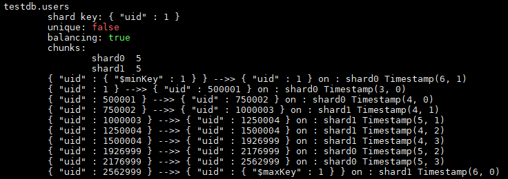 连接到 mongos ,对 testdb 数据库开启分片功能,同时设置集合 users 的分片键为用户 id,后面的`1`表示范围分片,如果想要采用哈希分片,则对应的写法为: `{uid:"hashed"}` 。