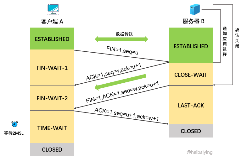 seq = w(在半关闭状态下 B 可能又发送了一些数据),另外还需要重复上次已经发送过的确认号ack = u + 1。之后 B 进入 LAST-ACK(最后确认)状态; -