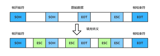透明传输是指不论何种数据都应当能够在链路上进行安全地传输。由于我们采用控制字符来封装帧,当传输数据中出现了控制字符时,就会导致无法正确区分出帧头帧尾,此时需要使用转移字符 ESC 来进行转义: